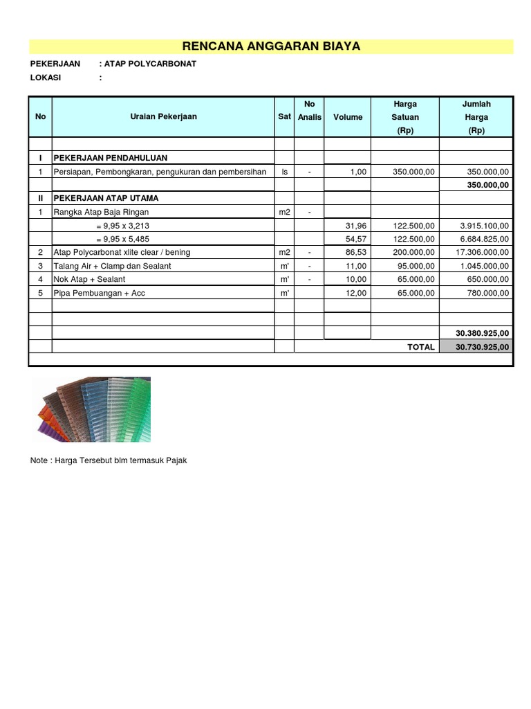 Order 500 meter persegi / m2. 5 maret 2016 5 maret 2016 jpk tinggalkan komentar. Harga polycarbonate memang cukup mahal, yakni berkisar antara 1 sampai 2,5 juta rupiah, tergantung jenis yang anda gunakan nantinya. Jika anda ingin mengaplikasikan atap polycarbonate, kami menyarakan untuk menggunakan struktur rangka baja ringan.dengan pertimbangan, ketika menggunakan rangka baja ringan, proses pemasangan akan lebih cepat dibanding menggunakan material rangka atap lainnya, seperti kayu dan besi. Jual polycarbonate nature lite untuk penutup atap dan pagar maupun kebutuan bangunan anda.